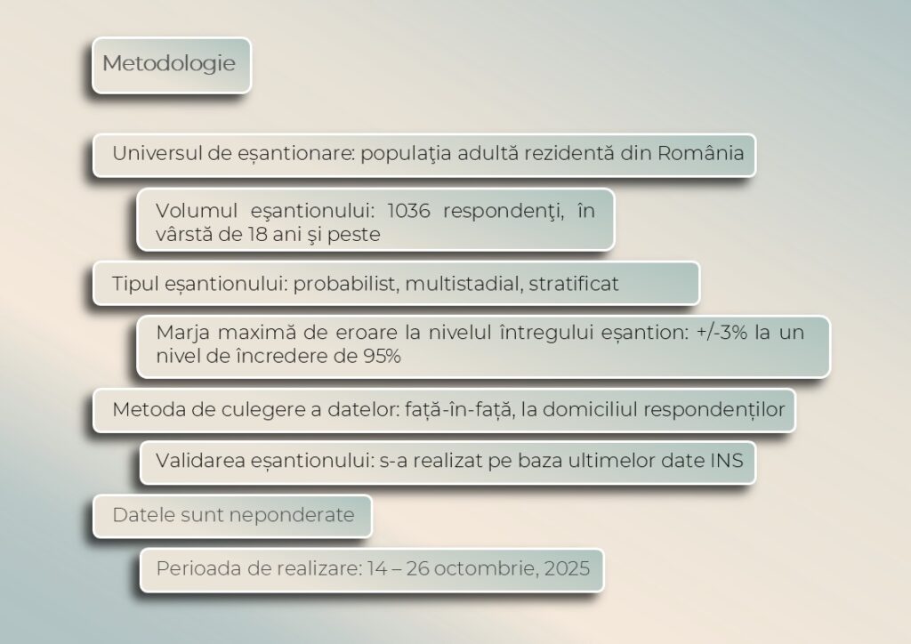 Sondajul a fost efectuat pe un eșantion reprezentativ de 1036 de respondenți adulți, prin interviuri față în față, la domiciliul acestora. Eșantionul a fost probabilist, multistadial și stratificat, iar marja maximă de eroare este de ±3% la un nivel de încredere de 95%. Datele sunt neponderate.