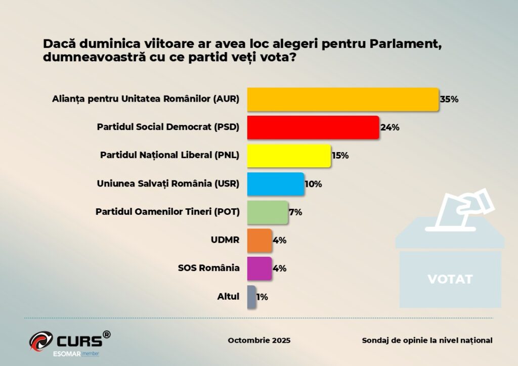 Sondajul CURS din octombrie 2025 indică o scenă politică dominată de AUR și PSD, cu PNL și USR situate la niveluri constante, dar sub pragul competiției directe.