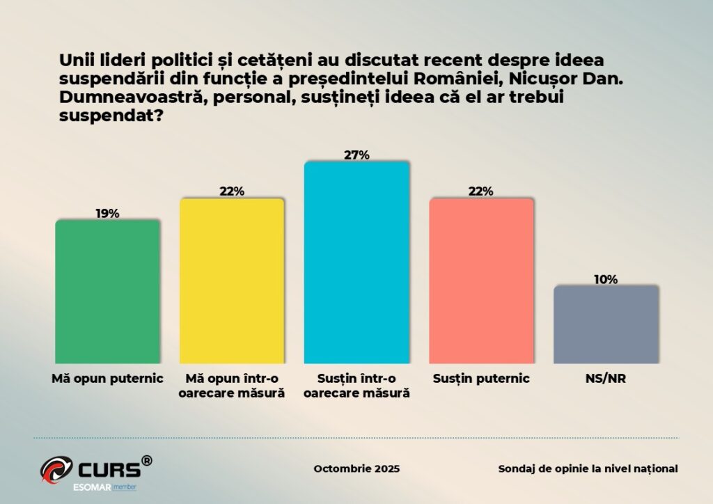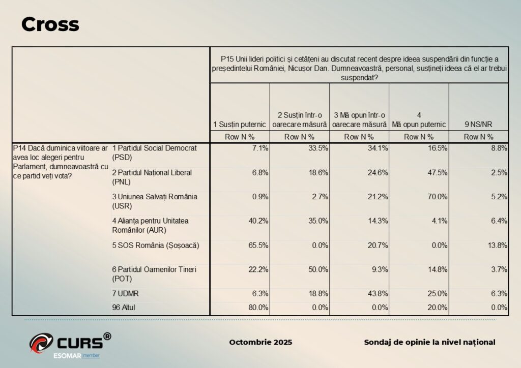 Într-un context marcat de tensiuni politice, Centrul de Sociologie Urbană și Regională, CURS, a realizat în perioada 14–26 octombrie 2025 un sondaj de opinie la nivel național. Cercetarea a urmărit intențiile de vot pentru Parlament, atitudinile față de suspendarea președintelui și percepțiile privind recentele evoluții politice.