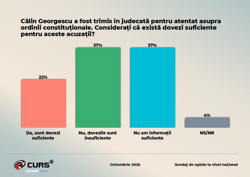Întrebați despre trimiterea în judecată a lui Călin Georgescu pentru atentat asupra ordinii constituționale, 22% dintre respondenți cred că există dovezi suficiente pentru aceste acuzații, în timp ce 37% consideră că dovezile sunt insuficiente, iar alți 37% spun că nu dețin suficiente informații pentru a se pronunța.