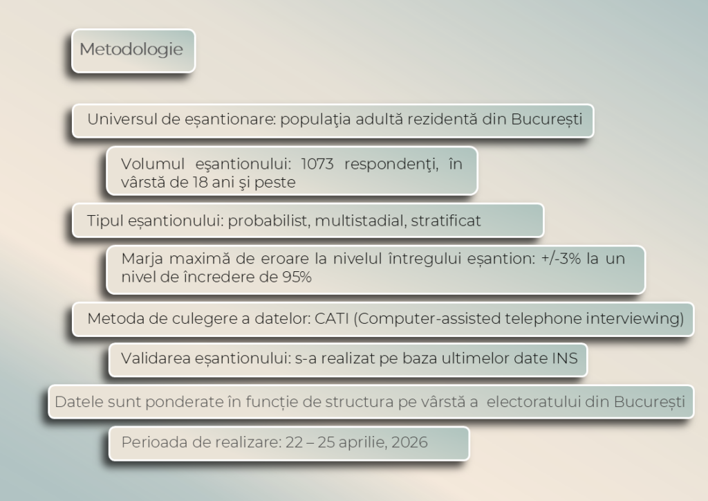 Cercetarea a fost realizată pe un eșantion de 1073 persoane adulte din București, în perioada 22–25 aprilie 2026. Marja de eroare este de ±3%, la un nivel de încredere de 95%.