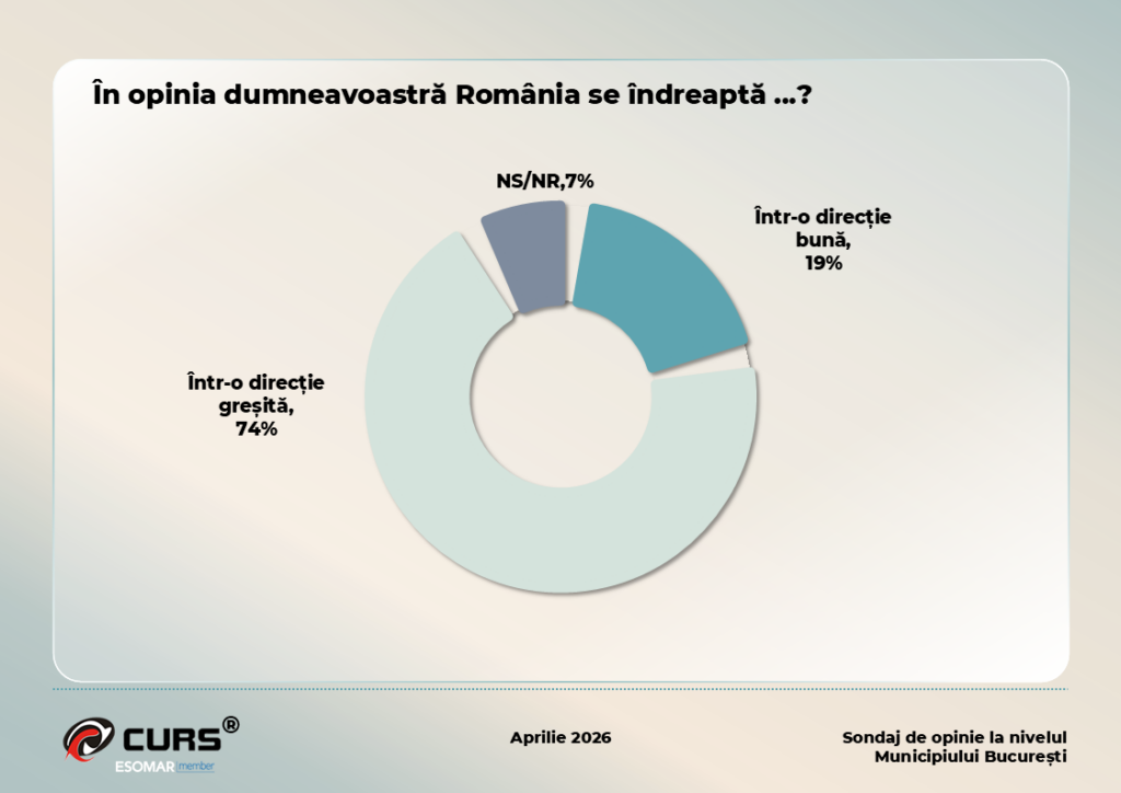 74% dintre bucureșteni cred că România merge într-o direcție greșită, în timp ce 19% spun că direcția este bună, iar 7% nu au o opinie. Diferența mare arată că percepția negativă rămâne clar dominantă.