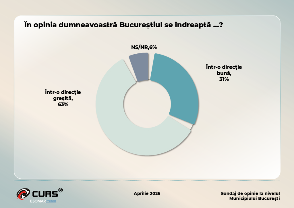 63% consideră că Bucureștiul merge într-o direcție greșită, iar 31% cred că direcția este bună, în timp ce 6% nu se pronunță. Deși evaluarea este ceva mai echilibrată decât la nivel național, nemulțumirea rămâne majoritară.