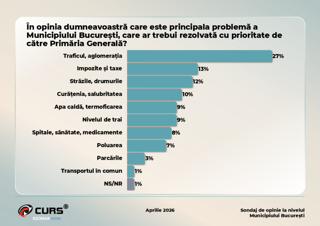 Traficul și aglomerația sunt indicate de 27% dintre respondenți, fiind principala problemă. Urmează impozitele și taxele, cu 13%, și starea străzilor, cu 12%. Curățenia este menționată de 10%, iar apa caldă și nivelul de trai de câte 9%. Sănătatea este indicată de 8%, poluarea de 7%, parcările de 3%, iar transportul în comun de 1%. Problemele de mobilitate și costuri domină clar preocupările bucureștenilor.