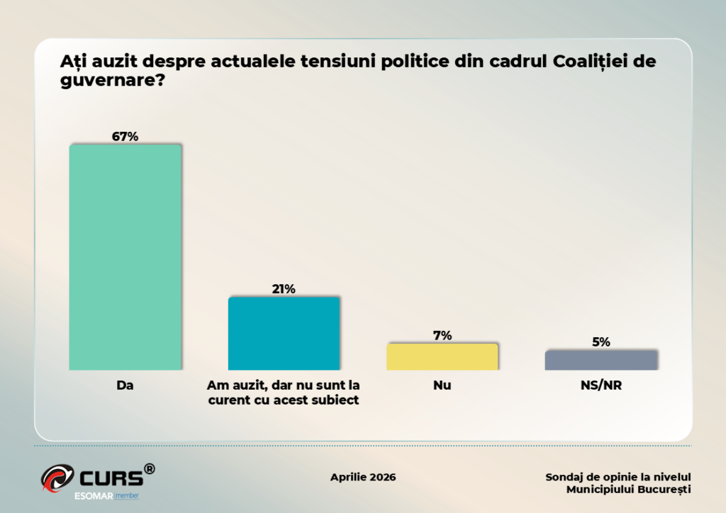 67% dintre bucureșteni spun că au auzit despre tensiunile din coaliția de guvernare, iar alți 21% au auzit, dar nu sunt foarte la curent. Doar 7% nu au auzit deloc, iar 5% nu au răspuns. Subiectul este, așadar, larg cunoscut în spațiul public.