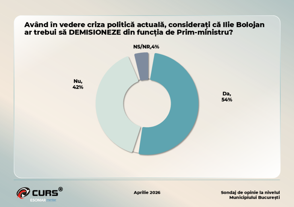 54% dintre respondenți consideră că Ilie Bolojan ar trebui să demisioneze, în timp ce 42% spun că nu, iar 4% nu au o opinie. Rezultatul arată o majoritate în favoarea demisiei.